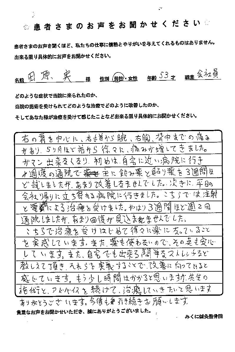 右の肩を中心に、右手首から腕・右胸・背中までの痛みがあり、5ヶ月ほど前から徐々に痛みが増してきました。