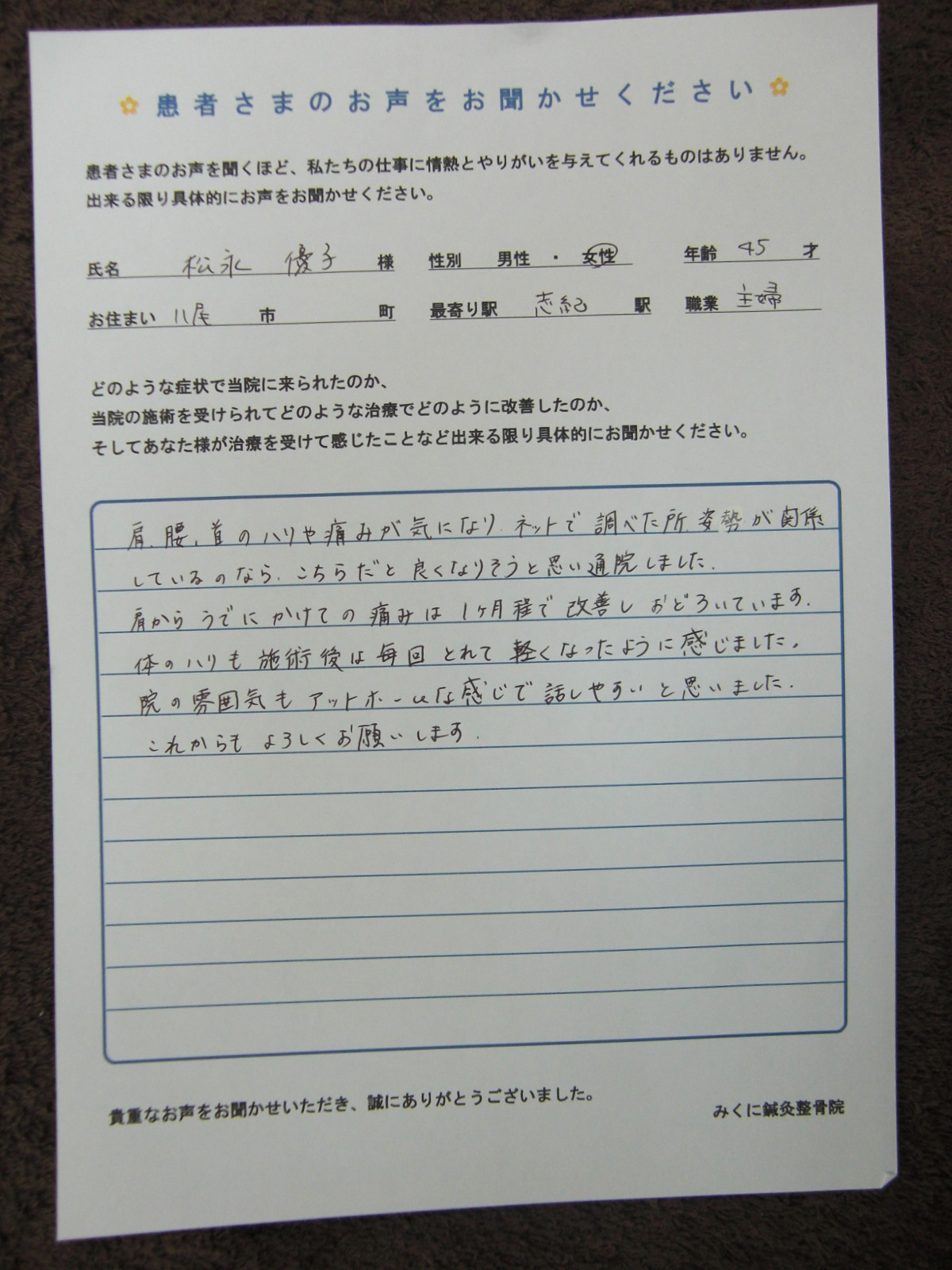 整体をして6回程で楽になりましたとお声をかけていただきました