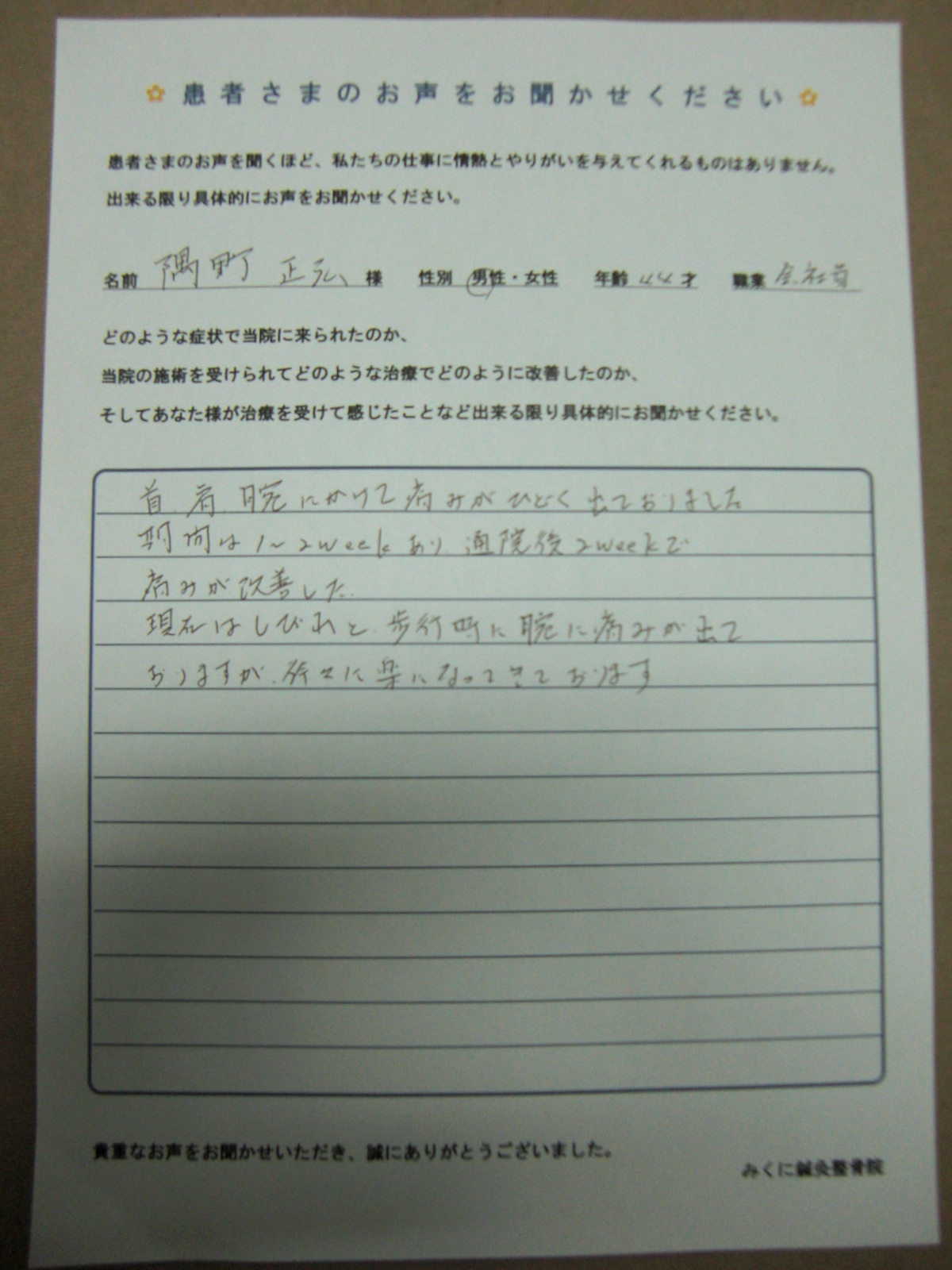 首肩腕にかけて痛みがひどく出ておりましたが、痛みが改善しました!