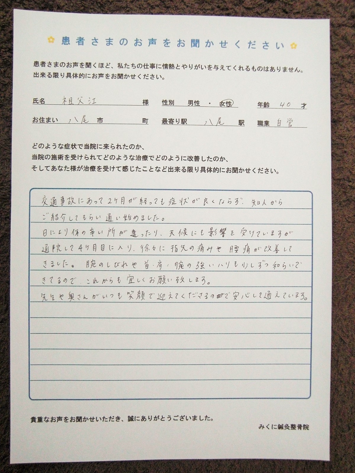 交通事故にあって2ヶ月が経っても症状が良くならず、知人からご紹介してもらい通い始めました。