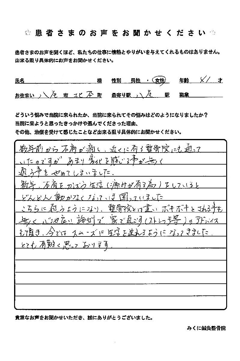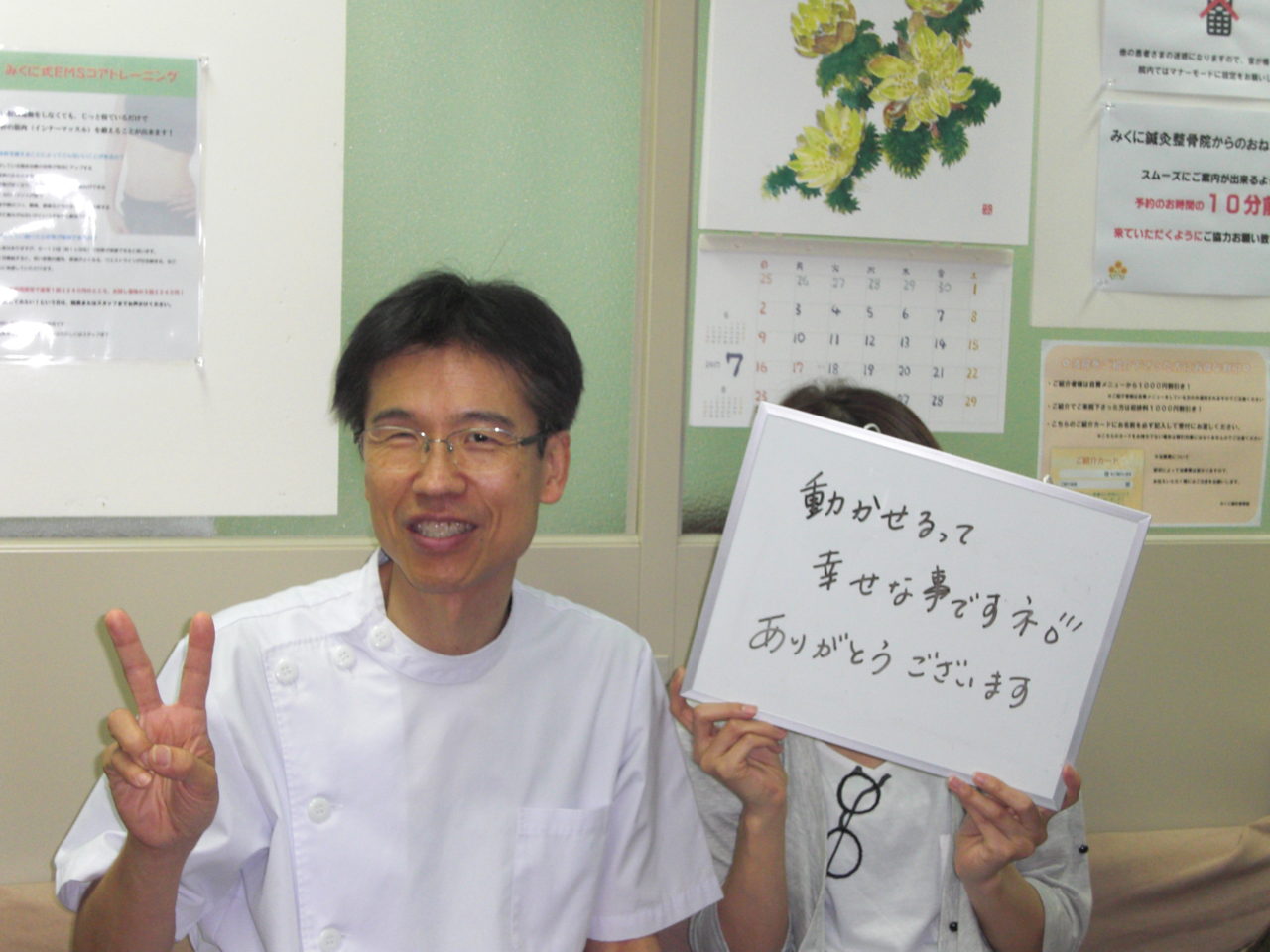 こちらに通うようになり、整骨院とは違いボキボキとされる事も無く心地良い施術で家で過ごす(ストレッチ等)のアドバイスも頂き、今ではスムーズに生活を送れるようになってきました。