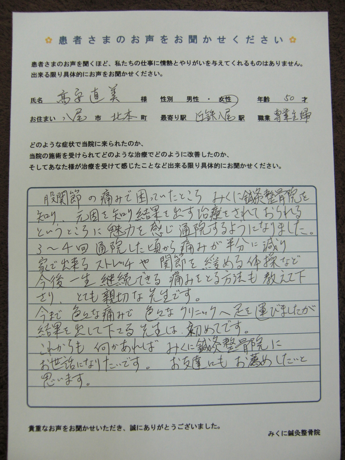 これからも 何かあれば みくに鍼灸整骨院にお世話になりたいです。お友達にもお薦めしたいと思います。