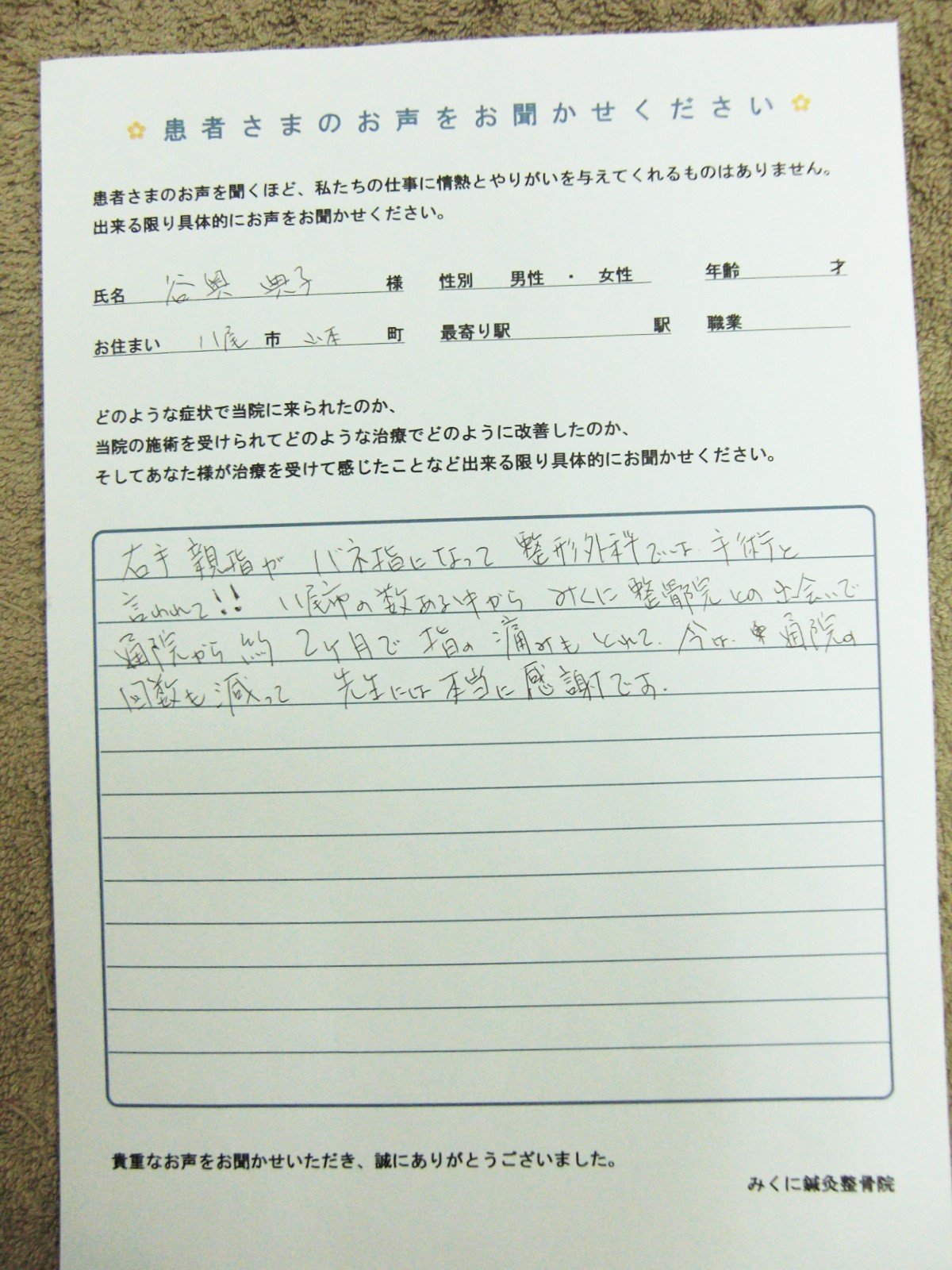 八尾市で数ある中から みくに整骨院との出会いで通院から約2ヶ月で指の痛みもとれて、