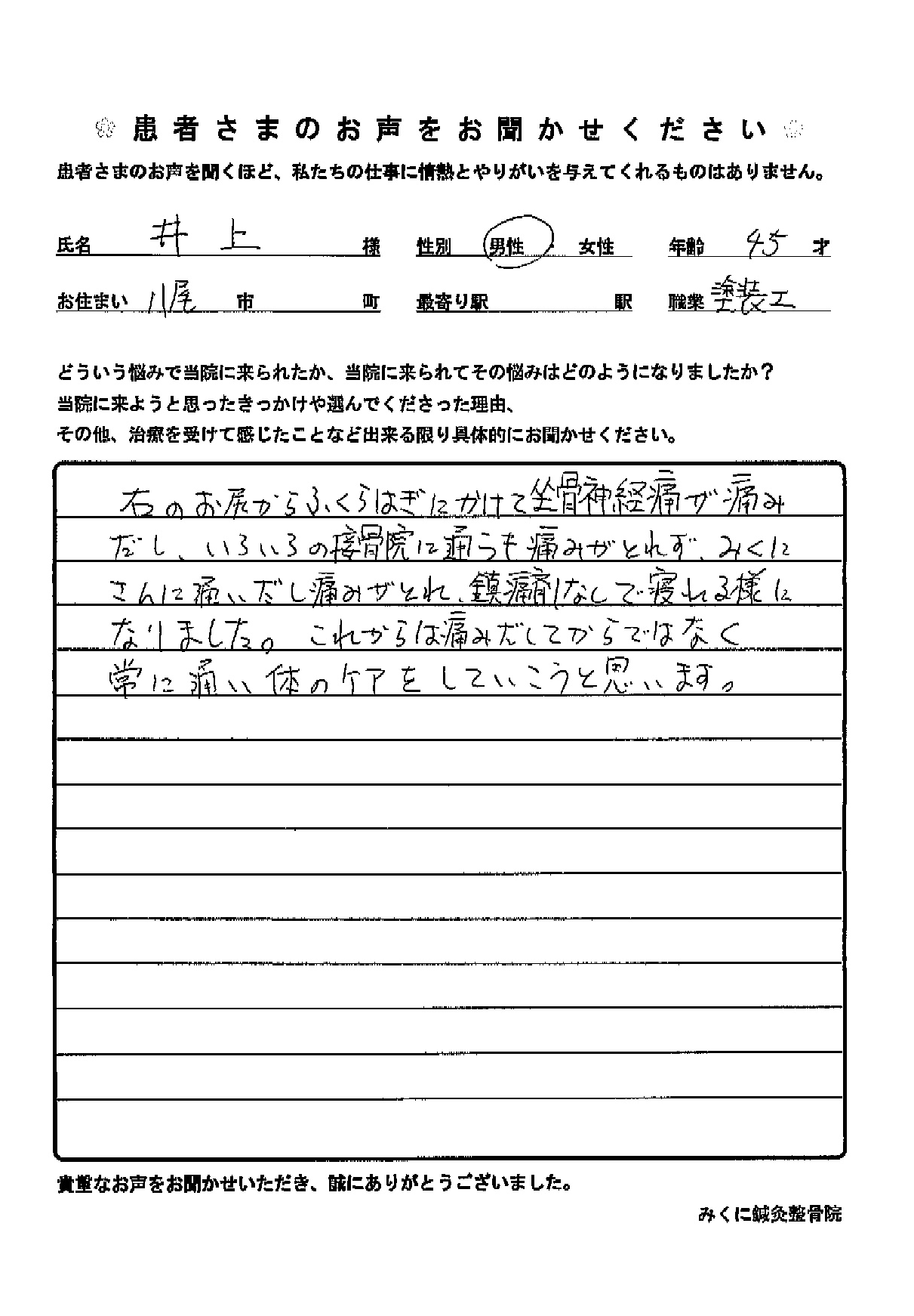 井上様は右のお尻(仙骨部)から右ふくらはぎの外側にかけての激痛でしたので、当院の整体と同時にハイボルト療法をさせていただいたところ、6回くらいで、ほとんどの痛みが無くなり、現在はメンテナンスで月1回の通院をしていただいています。