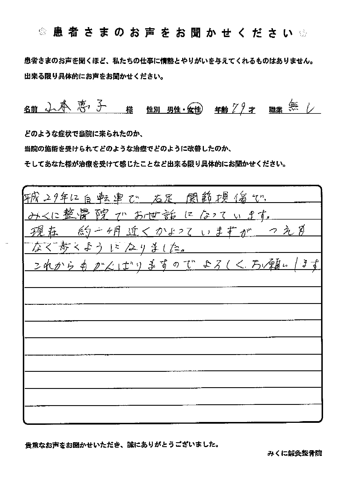 平成29年8月に自転車の事故で右足関節損傷(第一、第4、5右中足骨骨折等)になり、痛くて歩けなくて困っているところ、みくに整骨院で改善に向けて施術していただくことになりお世話になっています。