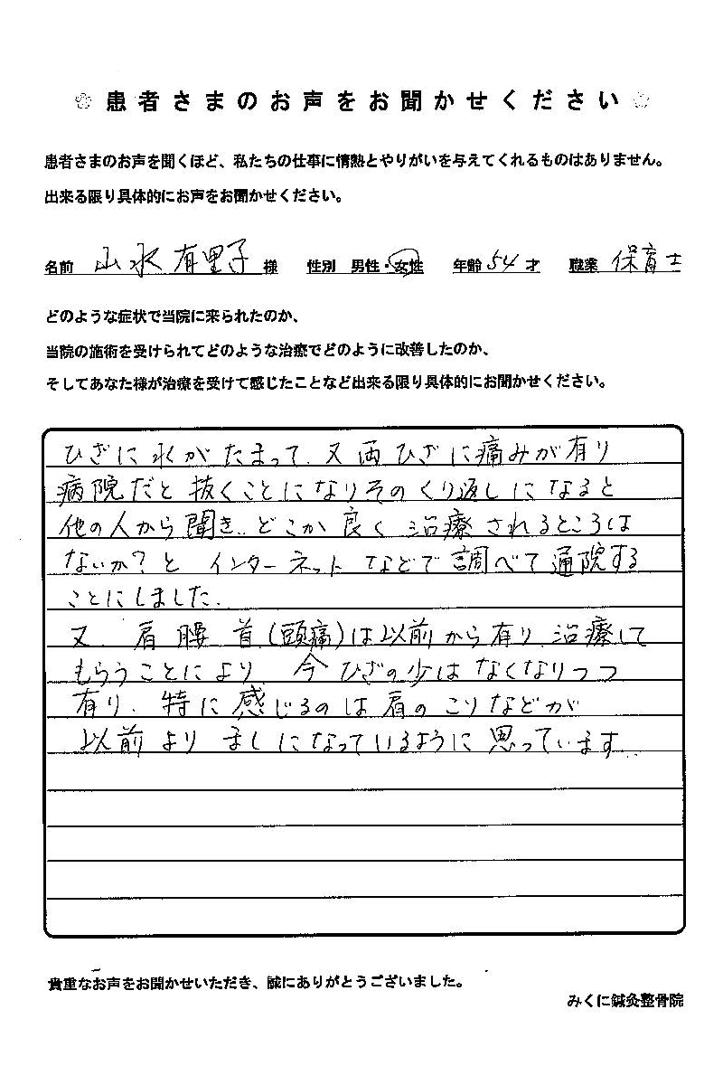 山水さまは長年ひざの痛みに苦しんでこられました。特に右ひざは水が溜まった状態が長年続き、ひざをつくと水が溜まっているので当たってうっとおしいと言っておられました。