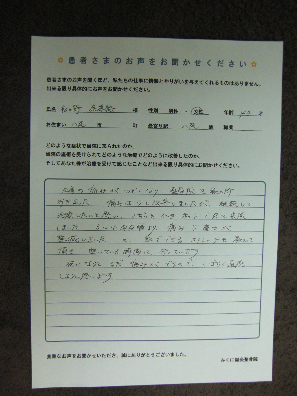 松ヶ野さまは最初、来院されたとき肩や首から左腕にかけての痛みと重さでかなりお辛い感じでした。